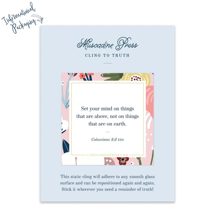 Cling to truth with our bright and cheerful scripture static clings. Designed to uplift, encourage, and remind you of truth, even in the middle of busy days. Stick them on the mirror, a window, or anywhere else you need a reminder of truth.